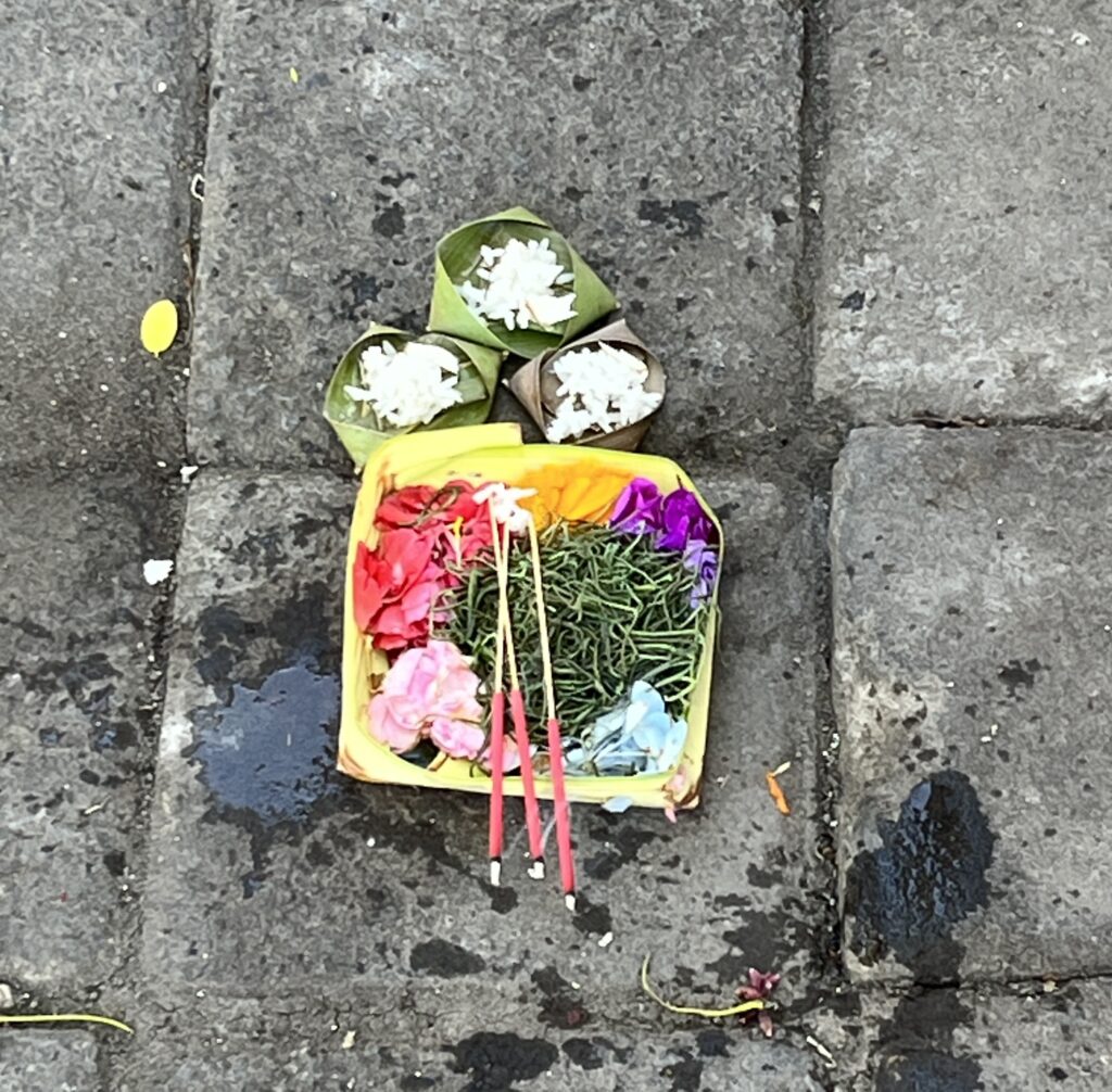 Indonezja jest krajem muzułmańskim. Oprócz Bali. Religią dominującą na tej wyspie jest hinduizm balijski, inaczej Agama Tirtha czyli „religia świętej wody”. Jest to odmiana hinduizmu, która łączy w sobie elementy hinduizmu, buddyzmu, a także stare wierzenia przodków. Dla mieszkańców bardzo ważna jest religia a widać to po wielu świątyniach, licznych dekoracjach, ceremoniach, festiwalach a także stale wystawianych małych koszyczkach z liści bananowca z darami takimi jak jedzenie czy papieros. Jest to dosłownie wszędzie, nie tylko przed świątyniami ale także przed drzwiami, bramami, na chodnikach, na ulicach. Stare nie są sprzątane tylko wciąż dokładane nowe, więc na wszędzie leży tego bardzo dużo.